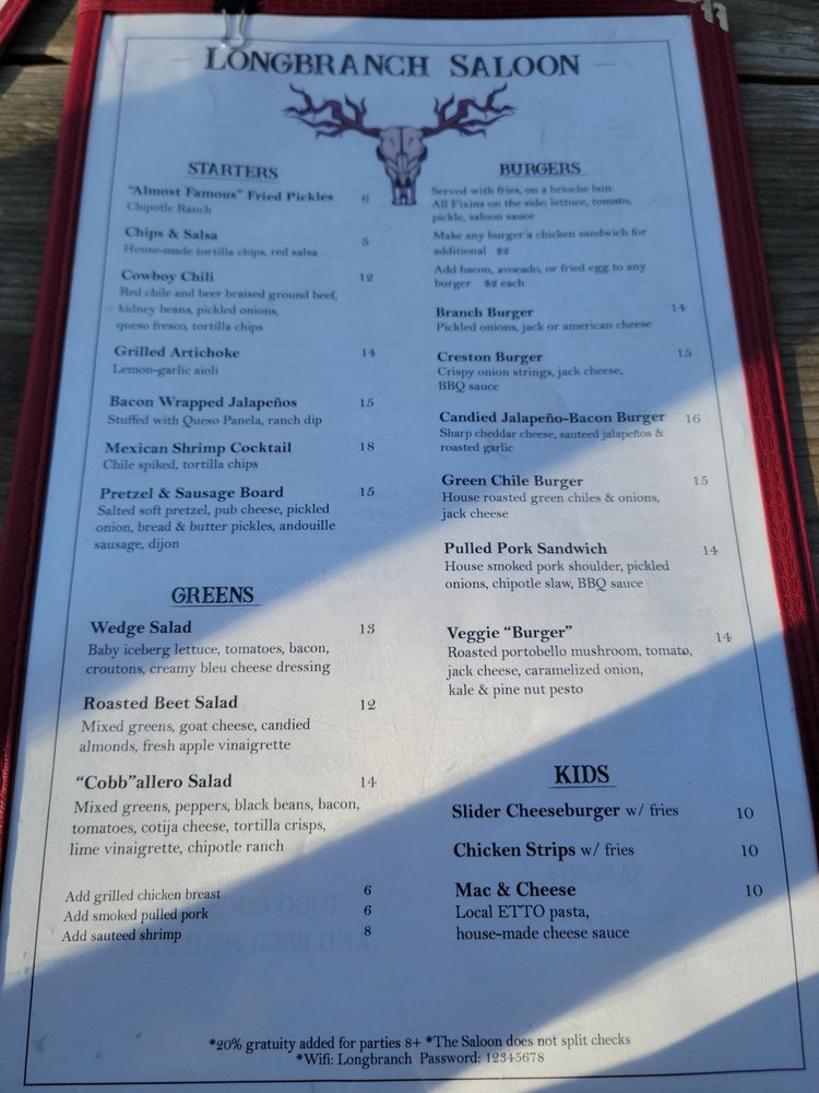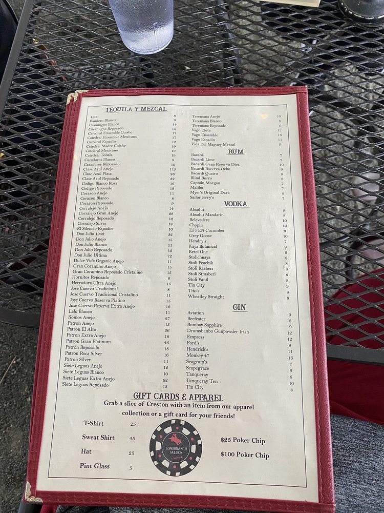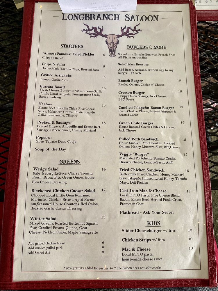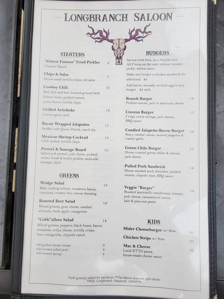 Longbranch Saloon, located in Creston, CA, offers a diverse menu with a focus on American burgers. The restaurant provides various amenities like takeout, reservations, delivery, and wheelchair accessibility. The menu includes enticing options such as the Branch Burger, Candied Jalapeno Bacon Burger, and Green Chile Burger. For those looking for lighter fare, there are options like Deviled Eggs and Beet Salad available. Customers rave about the flavorful food, with particular highlights being the Almost Fried Pickles, Creston Burger, and Crème Brûlée Cheesecake. Along with a wide selection of wines and beers, Longbranch Saloon also boasts a vibrant outdoor ambiance with live music, games, and a welcoming atmosphere for families. With quick and attentive service, it's a great spot to enjoy delicious food and a lively atmosphere.
